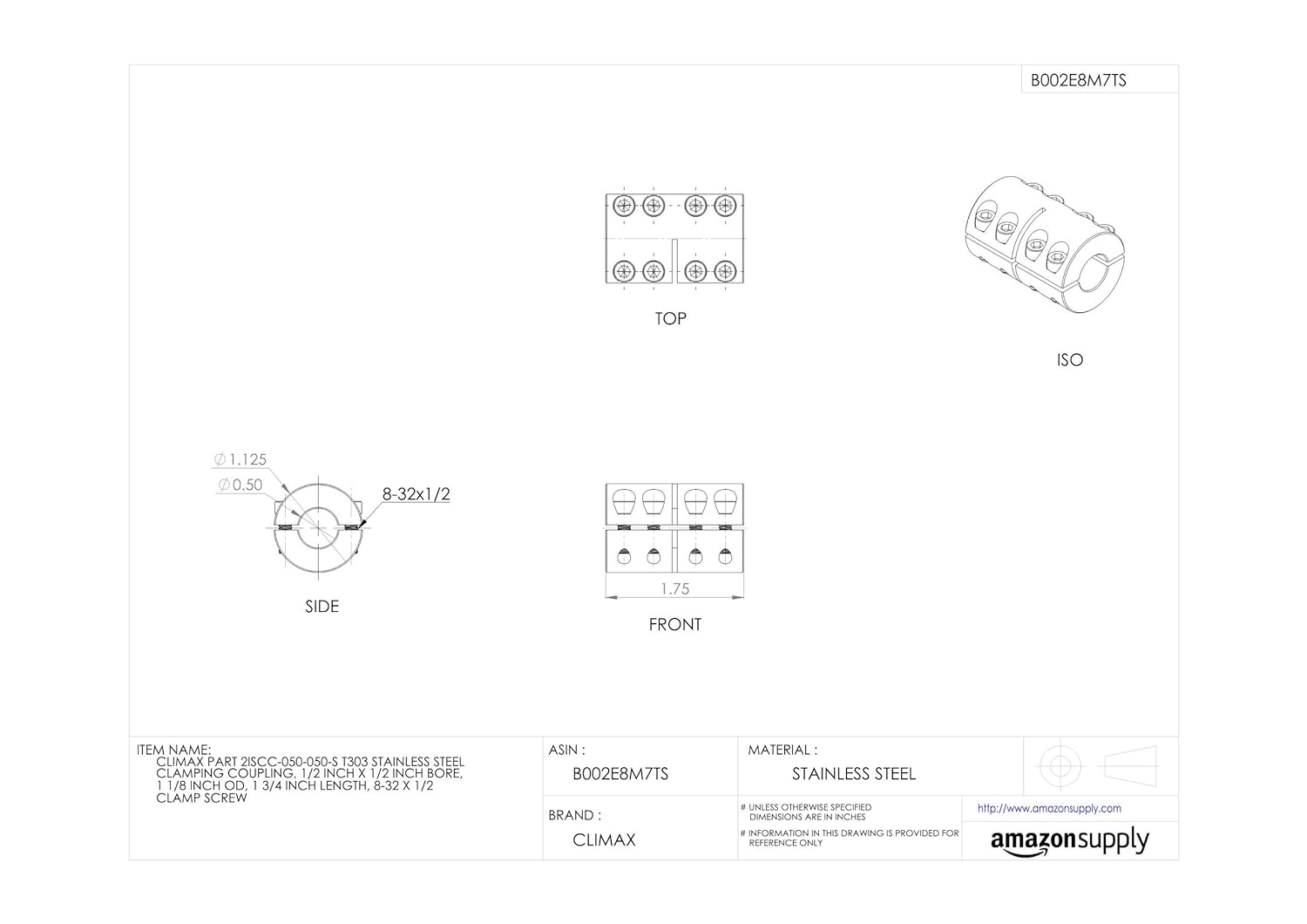 Climax Metal, 2ISCC-050-050-S, 2ISCC-Series Clamping Coupling, 1/2" x 1/2" ID, Stainless Steel. Features: Industry Standard Clamping Coupling High axial load and torque capacity Does not mar the shaft