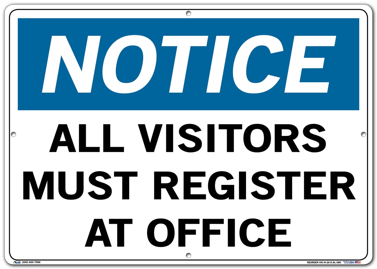 Vestil 20 1/2" x 14 1/2" "Notice / All Visitors Must Register At Office" Aluminum Sign SI-N-26-E-AL-080