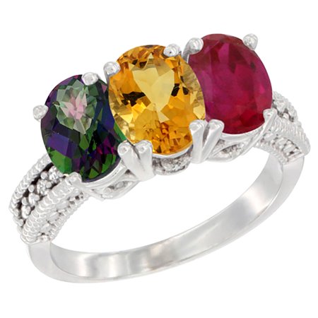 14K White Gold Natural Mystic Topaz, Citrine & Enhanced Ruby Ring 3-Stone 7x5 mm Oval Diamond Accent, sizes 5 - 10