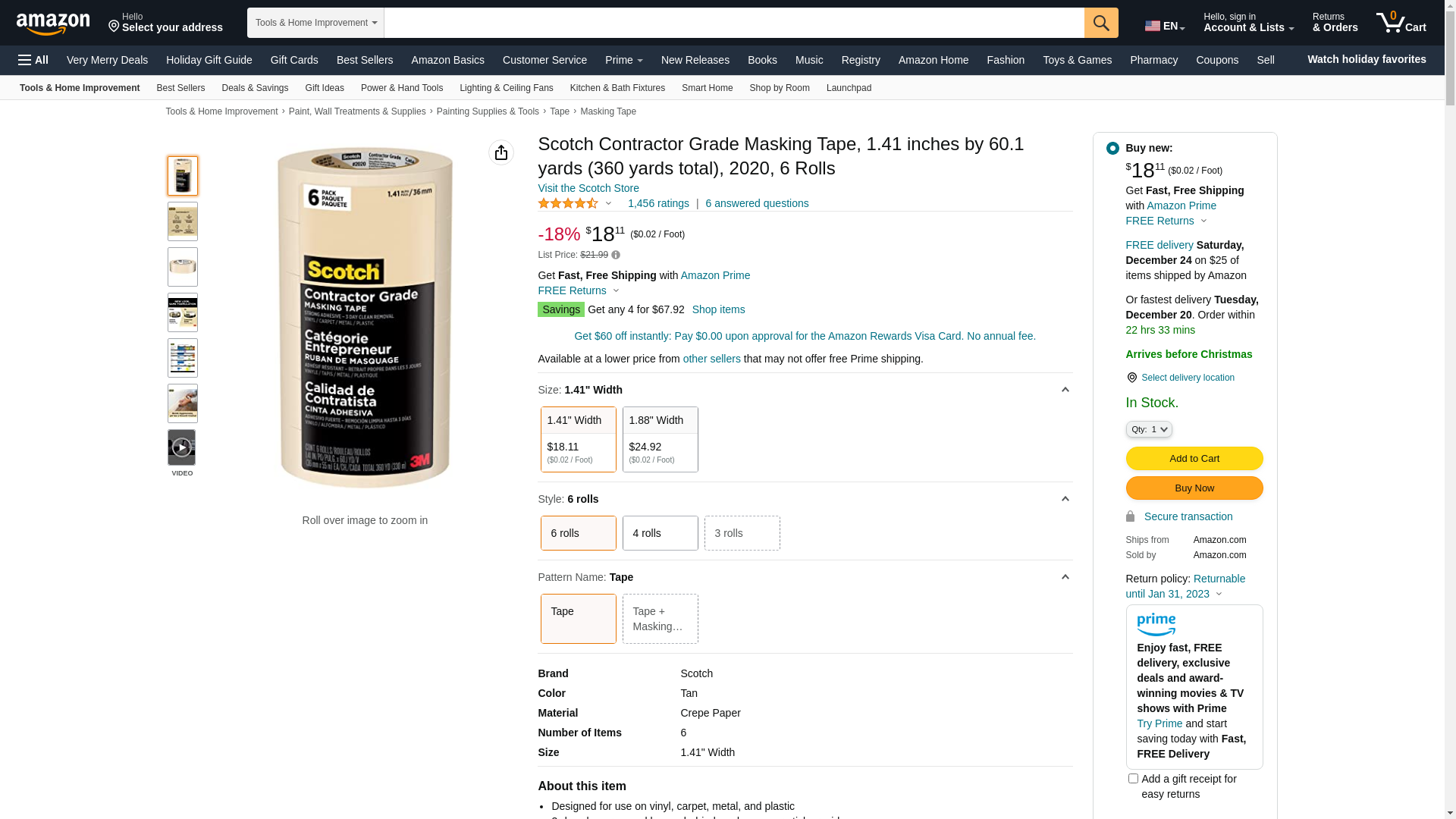 Scotch Painter's Tape 2020-36AP6 Scotch Contractor Grade Masking Tape, 1.41" Width, Tan, 24 Rolls