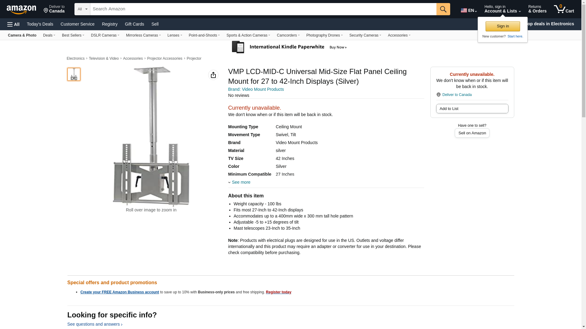 VMP LCD-MID-C Universal Mid-Size Flat Panel Ceiling Mount for 27 to 42-Inch Displays (Silver)