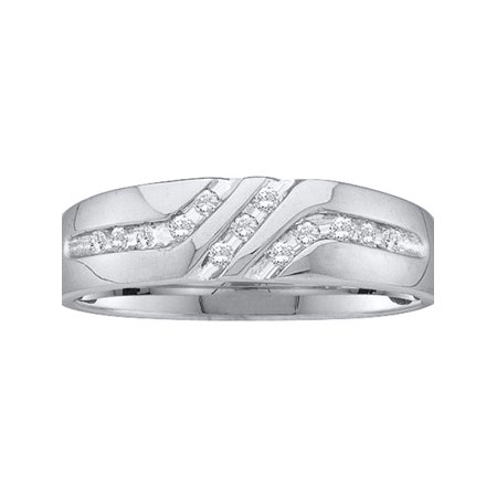 <ul> <li>10kt White Gold</li> <li>1/8 Carats total weight</li> <li>Widest point width: 5 mm (.2 inches )<br />; Width of shank: 3 mm</li> <li>2.15 grams (approximately)</li> <li>Ring size selectable. All diamonds are natural and conflict-free in origin.</li> </ul>