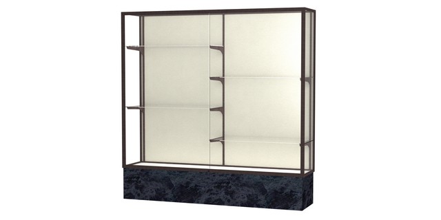 573PB-BZ-SS Base Color: Silver Swirl, Case Backing: Plaque Fabric, Frame Color: Dark Bronze Features: -Monarch Series collection. -Cases have an uncommon look for a great way to house your extraordinary accomplishments. -Anodized aluminum framing secures the sliding tempered glass doors and built-in locks. -Comes with interior lighting for added emphasis. -Made in the USA. -Top lighting: Puck. Product Type: -Trophy display case. Design: -Floor standing. Display Material: -Glass. Country of Manufacture: -United States. Frame Material: -Metal. Adjustable Shelves: -Yes. Dimensions: Overall Height - Top to Bottom: -72". Overall Width - Side to Side: -72". Overall Depth - Front to Back: -16". Overall Product Weight: -345 lbs. Base/Stand Height - Top to Bottom: -12".