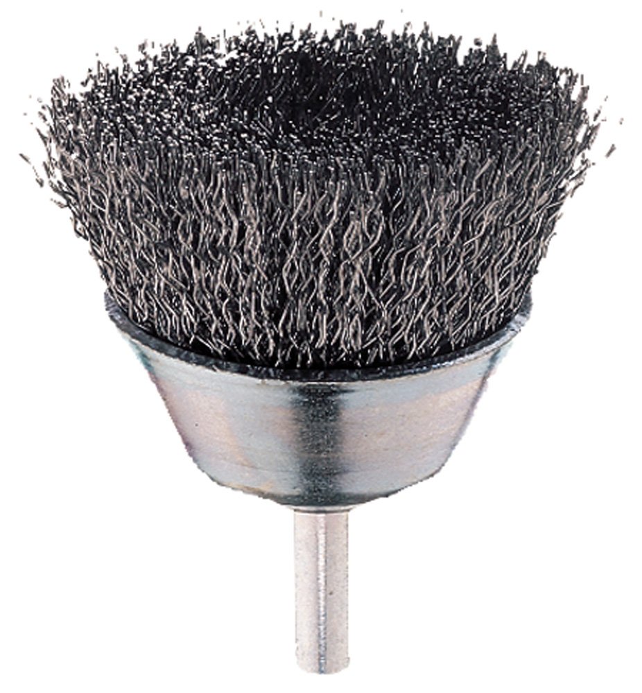 PFERD stem mounted power wire cup brush. Cup brushes are built with high quality components that are designed to perform in welding and industrial applications and use on easily accessible and level surfaces. Great cutting action and flexibility, excelling on large flat and curved surfaces. For optimal brushing action, tilt the brush between 15 and 30 degrees off of the workpiece surface. Gray carbon steel wire provides excellent abrasion and wear resistance, along with high flexing action. High strength filament able to remove heavy buildups. Good bend recovery. For weld and mold cleaning, light deburring, rust, paint and flash removal. Recommended for use on portable power tools to remove paint, burrs and corrosion. Uses in industries area: automotive, transportation, mining, electronics, aerospace, welding, nuclear, textiles, food services, construction, petrochemical, farming, medical, shipbuilding, fabricating, defense, foundries and plastics.