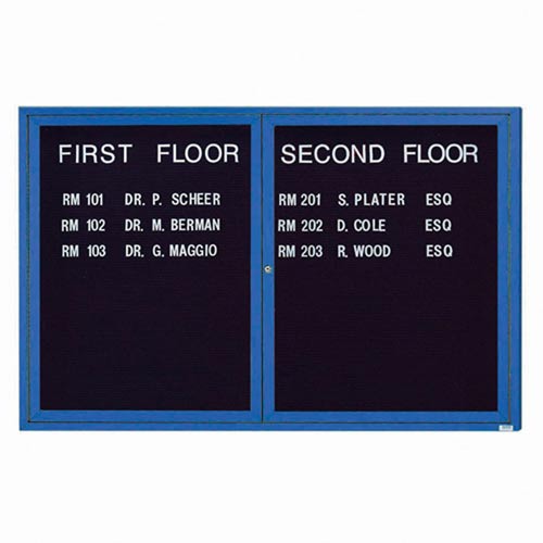 Aarco ADC4872IB 48" x 72" Enclosed Hinged Locking 2 Door Powder Coated Blue Aluminum Indoor Lighted Message Center with Black Letter Board
