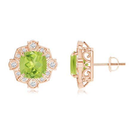 <ul> <li>Victorian Style Cushion Peridot Halo Stud Earrings in 14K Rose Gold (8mm Peridot)</li> <li>Approximate Carat Total Weight 4.84 ct</li> <li>Screw Back Closure</li> <li>Free Certificate of Authenticity and 30-Days Easy Returns.</li> <li>*Get a FREE Gemstone Pendant in Silver w/o Chain</li> </ul>
