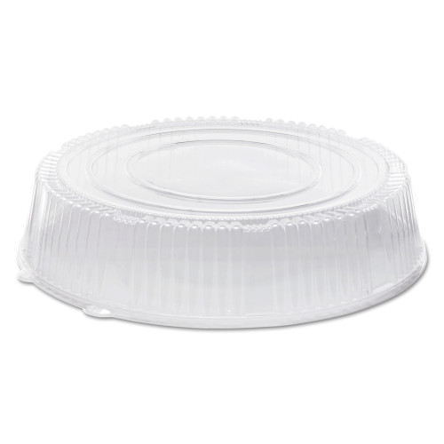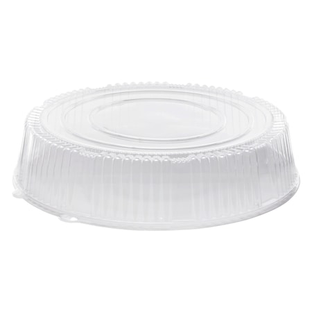 Clear, fluted dome lids are an attractive option for displaying and transporting food trays. Convenient press-n-lift tabs allow for easy removal. Dome edges are trimmed close to the tray edge to prevent accidental uncovering. Nesting feature allows easy stacking and prevents shifting en route, avoiding unnecessary spills and accidents. Convenient dome lids are usable with multiple items; fitting with CaterLine, CheckMate and CaterLine Casuals products. Food Container Type: Lid; Material(s): PET; Color(s): Clear; Diameter: 18".