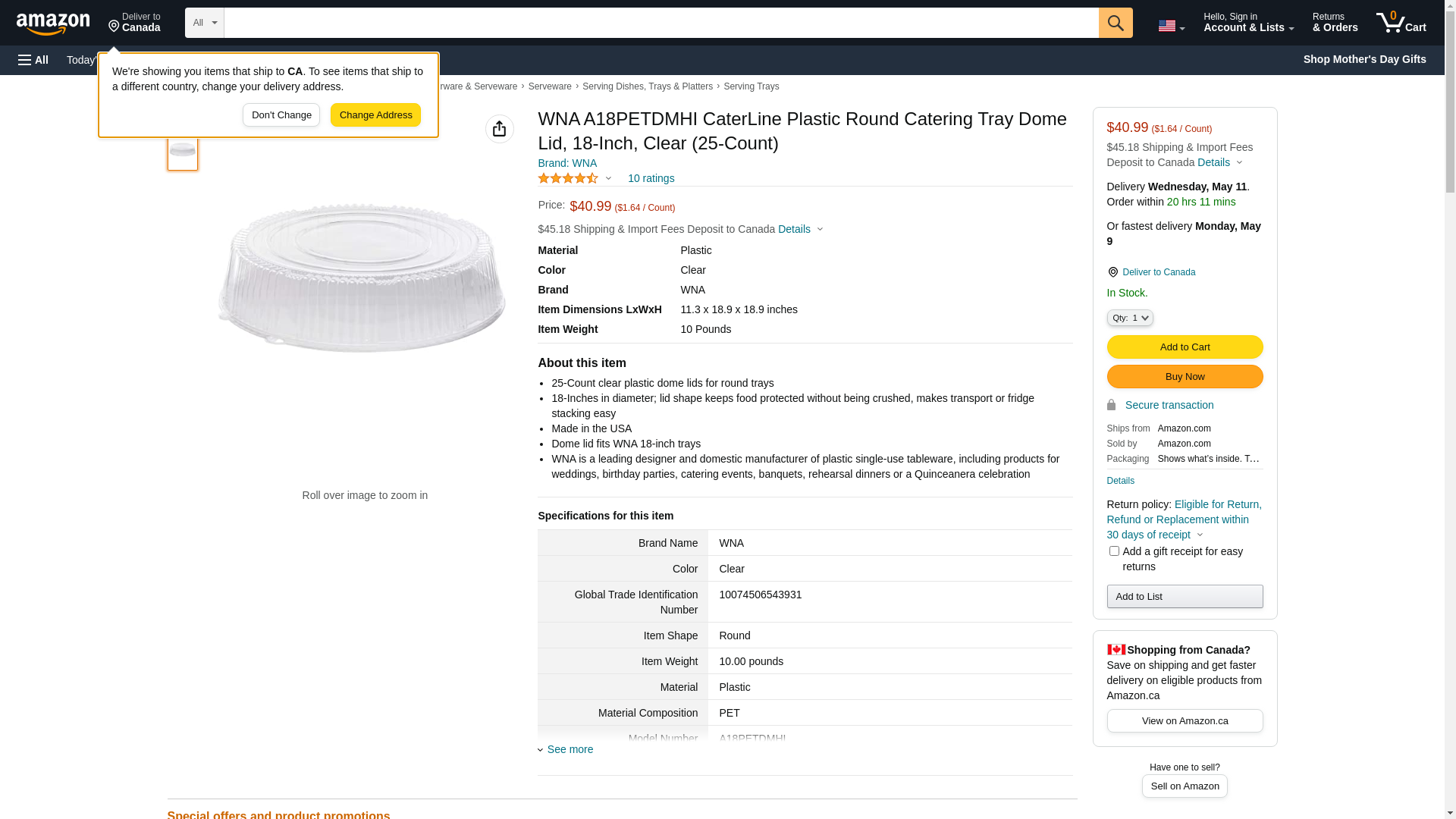 Wna Wnaa18petdmhi Caterline Dome Lids Plastic 18-Inch Diameter X 3 5/8-Inchhigh Clear 25/Carton