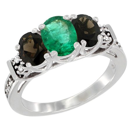 14K White Gold Natural Emerald & Smoky Topaz Ring 3-Stone Oval Diamond Accent, sizes 5-10