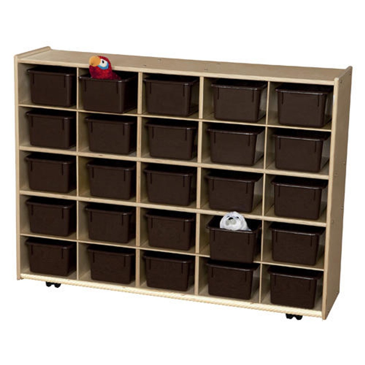 Contender 25 Cubby Storage Cabinet with Chocolate Pastel Trays [Comes Fully Assembled], with Wheels, for Classroom, Homeschool, Kindergarten, in Natural Finish
