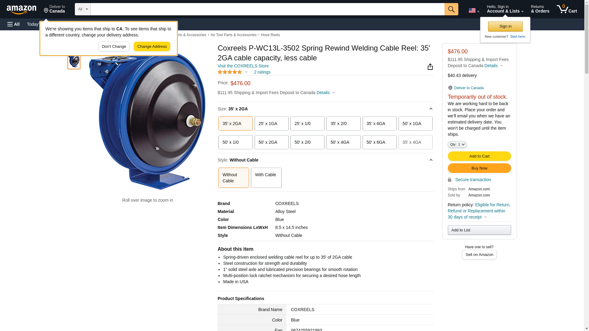 Coxreels P-WC13L-3502 Spring Rewind Welding Cable Reel: 35' 2GA cable capacity, less cable