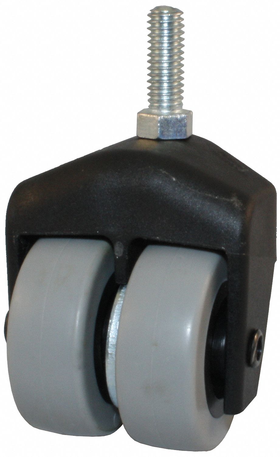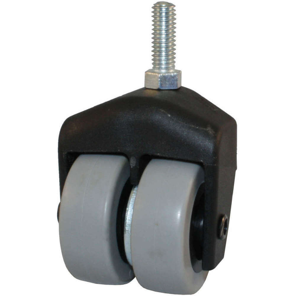 2" DUAL WHEEL BLACK COMPOSITE DISPLAY CASTER BODY <br> TWO 2" X 3/4" GREY TPR WHEELS ON BLACK PP CORE <br> 3/8-16 X 1" THREADED STEM <br> 1/2" HEX NUT AT BASE