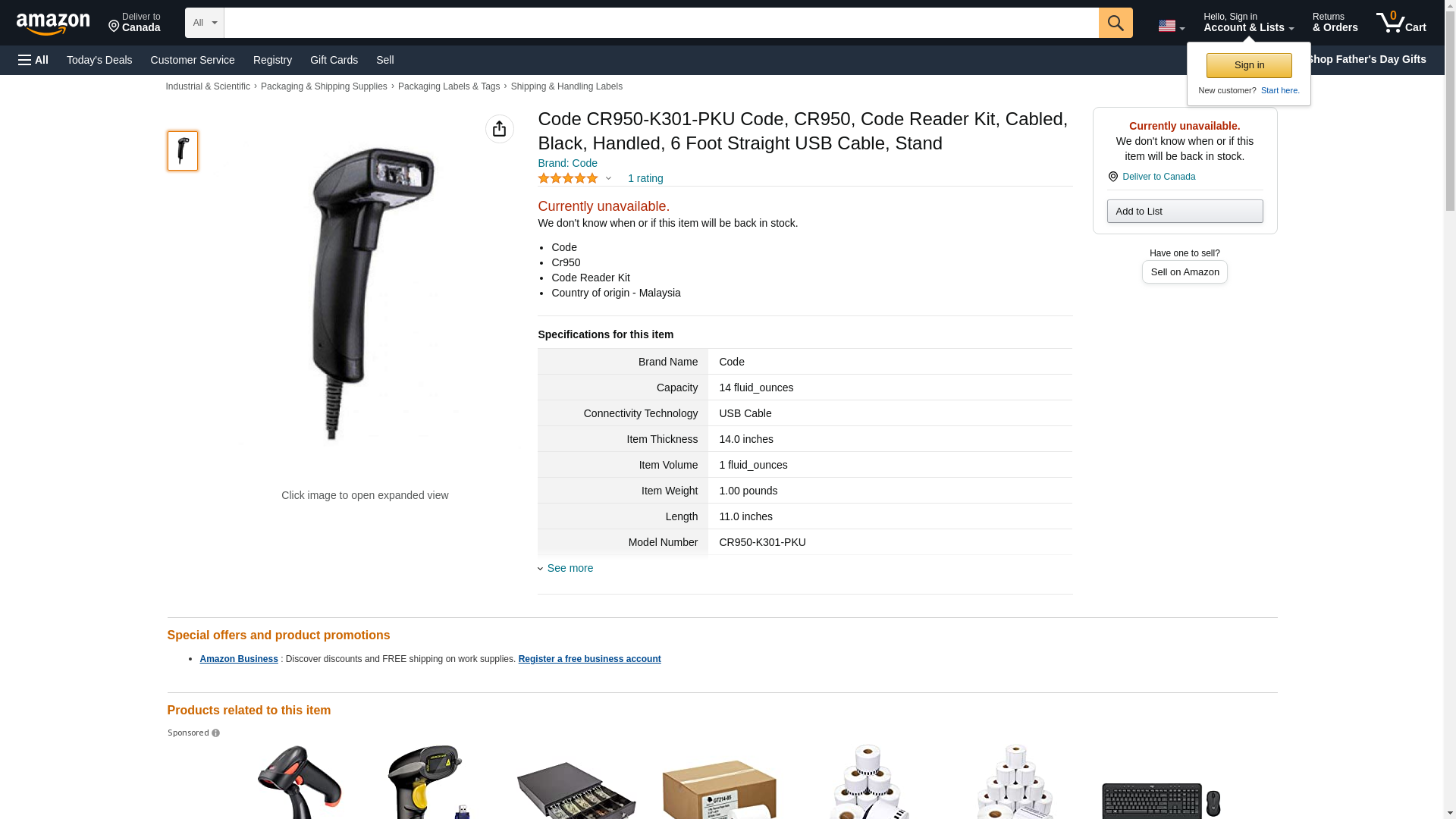 Code CR950-K301-PKU Code, CR950, Code Reader Kit, Cabled, Black, Handled, 6 Foot Straight USB Cable, Stand