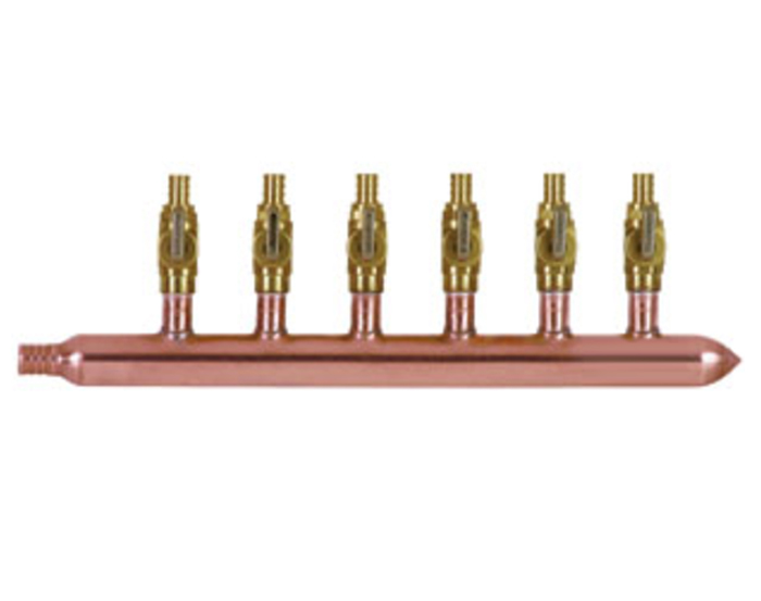3/4" crimp style PEX inlet. Spin closed outlet. (6) branches with 1/2" PEX ball valves, at 2" OC. 1" Copper pipe size manifold trunk.