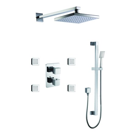 - This complete shower set includes: Water Diverter, Temperature Control, On/Off Control, Rain Showerhead, Handheld Showerhead, 4 body sprays.