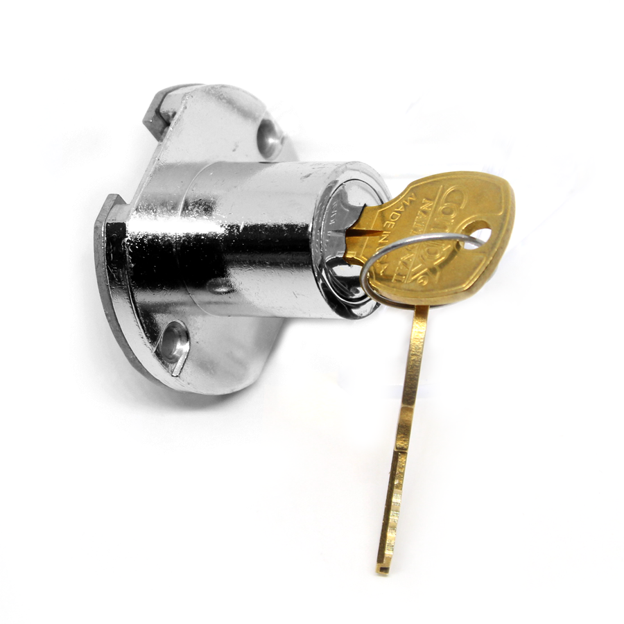 ' Disc Tumbler Cam Door Lock, Dead Bolt, Bright Brass Finish, Mounting Hole Dia. 7/8 In., Head Dia. 7/8 In., Cam Length 11/32 In., Cam Width 5/8 In., Max. Latching Distance 1/8 In., For Door Thickness 15/16 In., Unlock Turn Direction Left, Unlocking Radius 180 Deg., Number of Pins 5, Key Number KD, Includes Two Keys and Mounting Hardware, Key Type Different '