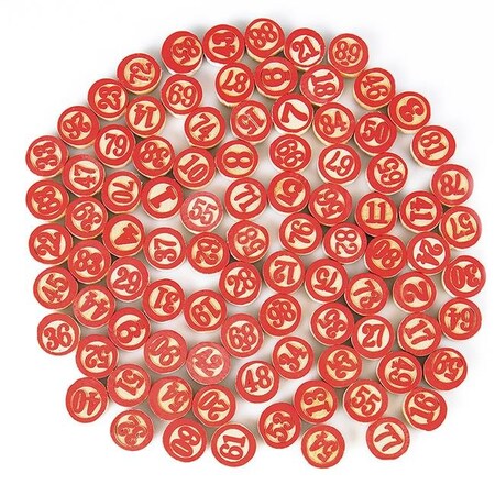 - 90 Rustic Wooden Chips: These tiles are made of cuts of natural wood, numbers painted red to match traditional Tombola, and have a completely blank underside to be used as bingo chips