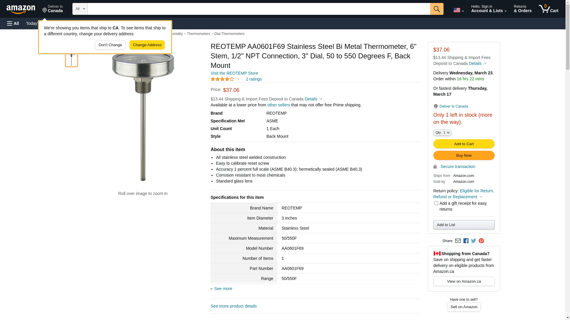 REOTEMP AA0601F69 Stainless Steel Bi Metal Thermometer, 6" Stem, 1/2" NPT Connection, 3" Dial, 50 to 550 Degrees F, Back Mount