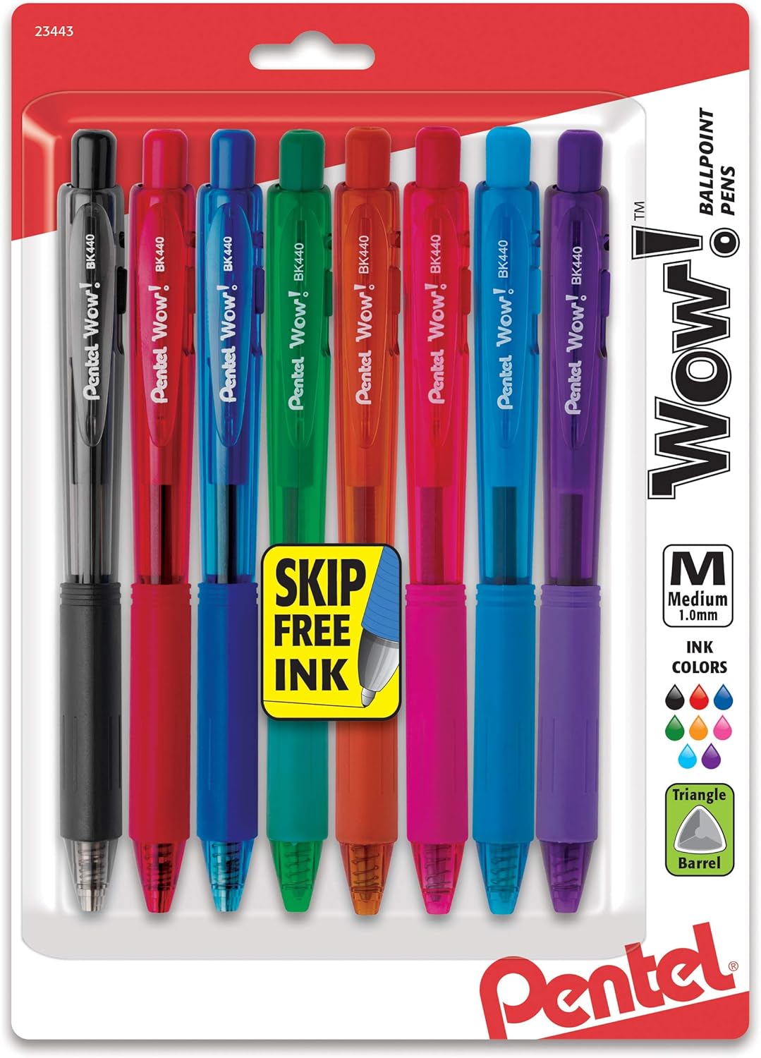 Pentel WOW! Colors Retractable Ballpoint Pens, Medium Line, Assorted Ink Colors, 8 Pack (BK440BP8M)