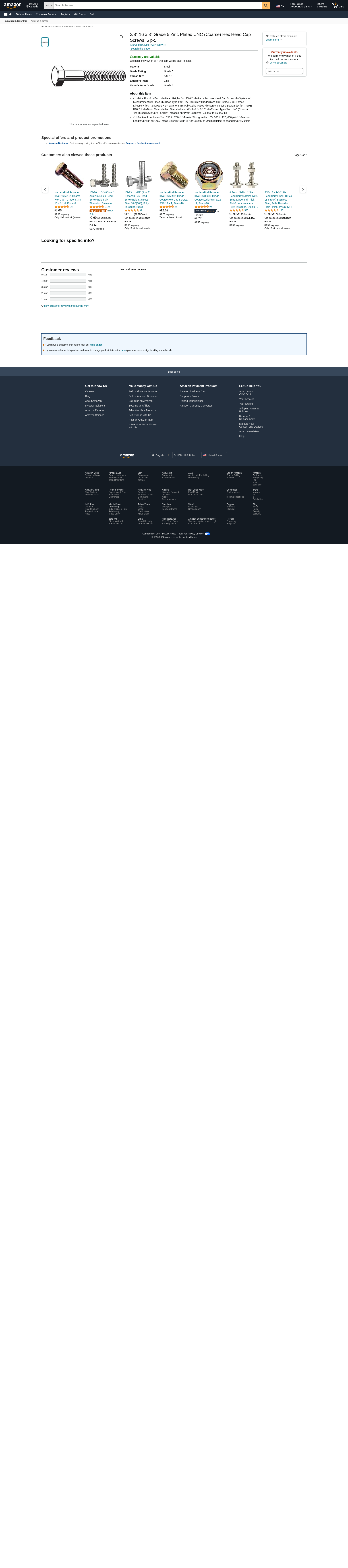 3/8"-16 x 8" Grade 5 Zinc Plated UNC (Coarse) Hex Head Cap Screws, 5 pk.
