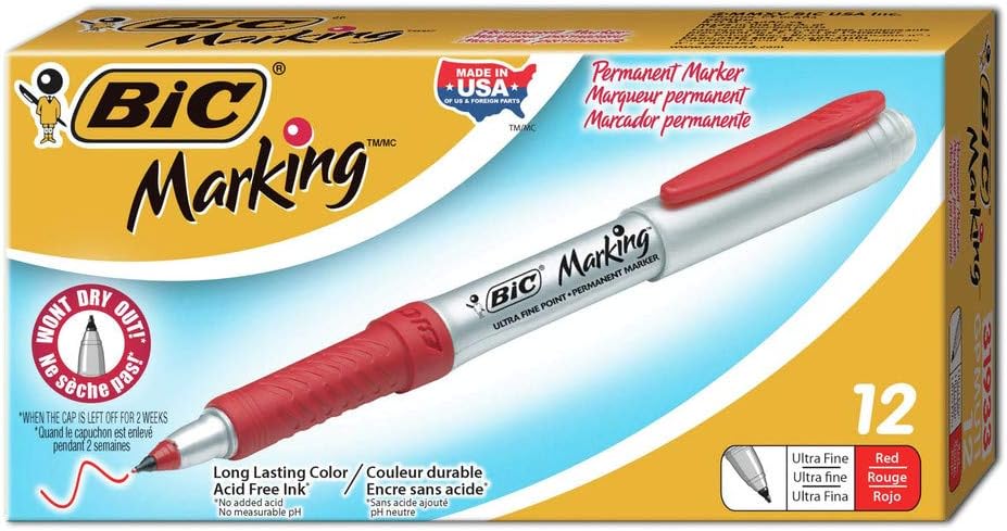 As an Amazon Associate, we earn from qualifying purchases. BIC Grip Ultra-Fine-Point Permanent Markers, Red, Pack of 12 BIC . B004UHO956 Gallery Attributes Brand name, Manufacturer name, Manufacturer, Attribute00, Attribute01BIC Attribute0212 Attribute03Red Attribute04Metal Attribute05GPMU11RED Attribute06, SKUB004UHO956 AttributeKey00Manufacturer AttributeKey01Brand AttributeKey02Number of Items AttributeKey03Ink Color AttributeKey04Tip Type AttributeKey05Manufacturer Part Number AttributeKey06ASIN Extra Product NameBIC Grip Ultra-Fine-Point Permanent Markers, Red, Pack of 12 dataSourceamazonScraper moq, multiple, tierMinQty11 qtyInStock0 snippetClick images to enlarge: List Price $ 15.45Manufacturers Item number: GPMU11 REDMARKER,ULTRA FINE,RDIdeal for small spaces and detailed crafts. Textured rubber grip is engineered for comfort and control. Marks on glass, metal, CDs, coated paper, photos, plastics. Long cap-off life. Vivid, quick-drying ink resists water. Marker Type: Permanent; Color(s): Rambunctious Red; Tip Type: Ultra Fine; Ink Types: Non-Washable.Package Includes Manufactured by BIC Product SpecificsSold as DozenTo order a carton, order 18 DozenItem may be returned for 30 days from date of purchaseUPS ShippableAssembly Required: NoMade from Recycled Material: NoItem Weight: .3 lbs.Carton Weight: 7 lbs.Material Safety Data Sheet Available here BIC; Mark-it; Marker; Markers; Permanent Marker; Rambunctious Red; Red Ink; Writing; Utensil; Arts; Crafts; Education; Schools; Classrooms; Teachers; Students Distributor offers SellerSKUMOQIn stockMultiplePrices AmazonB004UHO95611