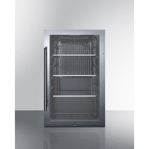 Summit Appliance SPR488BOSCSS Shallow Depth Indoor/Outdoor Beverage Cooler, Built-in Capable, Weatherproof Design, 17 Shallow Depth, Automatic Defrost, Automatic Defrost, Adjustable Shelves The SPR488BOSCSS features a versatile design that meets NSF-7 and UL-471 commercial standards, but is also approved for residential use. Sized at just 19 inches wide and 17 inches deep, it features a stainless steel cabinet with a sealed back for safe installation in the outdoors Key Features: Automatically illuminates when the door is open for an attractive and energy efficient view Built-in capable Ideal for home wet bars, island kitchens, and other applications with limited footprint space Three glass shelves with six positions for optimal storage and easy cleaning Dial thermostat with seven temperature settings offers easy temperature management Keyed lock offers added security, with two keys included Heat resistant design provides clear view of stored products, with an elegant trim in seamless stainless steel Fully finished stainless steel cabinet Specifications: Overall Dimensions (HxWxD): 33 x 19 x 17 Weight: 75 lb Capacity: 3.13 cu.ft. (89 L) Defrost Type: Automatic Door: Glass Cabinet: Stainless Steel Energy Usage/Year: 285kWh/year Amps: 1.3 Voltage/Frequency: 115 V AC/60 Hz Door Swing: RHD Shelf Type: Glass Adjustable Shelves: Yes Can Storage: Yes Thermostat Type: Dial Fan Type: Interior Temperature Range: 34 to 50 Degree F Sound Level: 32.6 dB