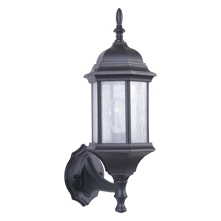 - DETAILS: Constructed of Cast Aluminum with Textured Matte Black Finish and Clear Seeded Glass Shade