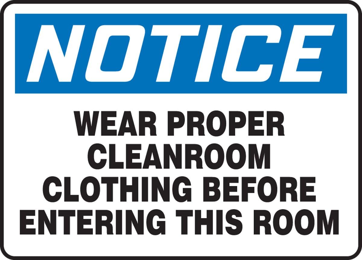 NOTICE WEAR PROPER CLEANROOM CLOTHING BEFORE ENTERING THIS ROOM 7" x 10" Plastic Sign