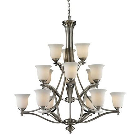 | Feature | With its fifteen uniquely shaped matte opal shades, this brushed nickel finished chandelier will dazzle any onlooker |
