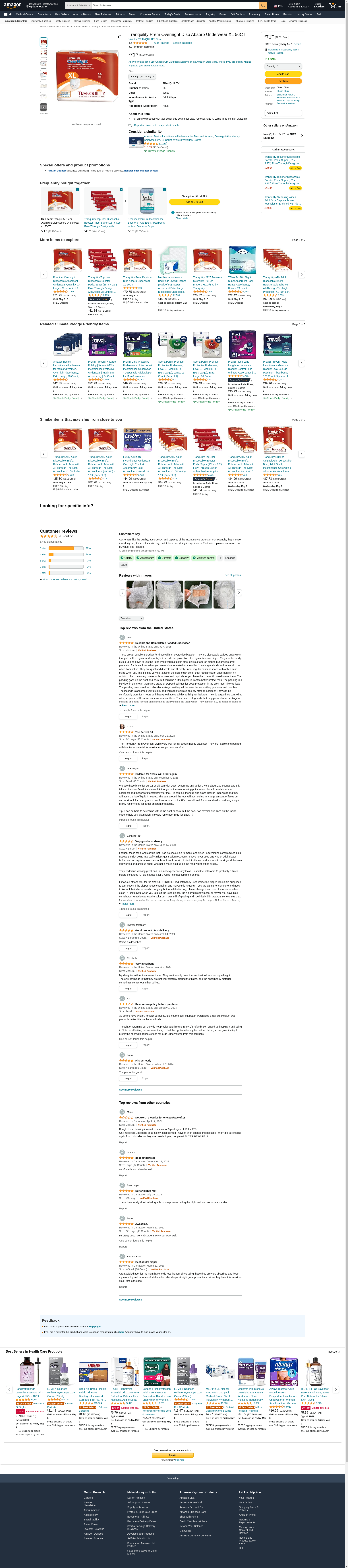 Tranquility Premium OverNight Disposable Absorbent Underwear (sometimes called pull-on or pull-up diapers) provide maximum protection and guaranteed performance for uninterrupted sleep and extended wear including during long airplane flights. Larger sizes hold over one quart of fluid. They are designed with comfortable, breathable sides and an ample, full-rise waist panel providing a more proportioned fit. Tear-away side seams allow for easy removal. The soft, cloth-like inside layer of the diaper is gentle against your skin. The underlying, high-capacity, absorbent peach core contains superabsorbent polymers that guarantee skin dryness, odor reduction, urine pH neutralization, and inhibition of bacterial growth. Kufguards (inner leg cuffs) channel fluids into the core, helping to contain high volume urge episodes and bowel incontinence. Available in six sizes (X-Small, Small, Medium, Large, X-Large (XL), 2X-Large (XXL)). Blue leg elastic indicates the Premium OverNight product compared to the Premium DayTime product for all sizes except the X-Small and Small. (The X-Small and Small diapers are only available as a Premium OverNight product.) Latex-free.