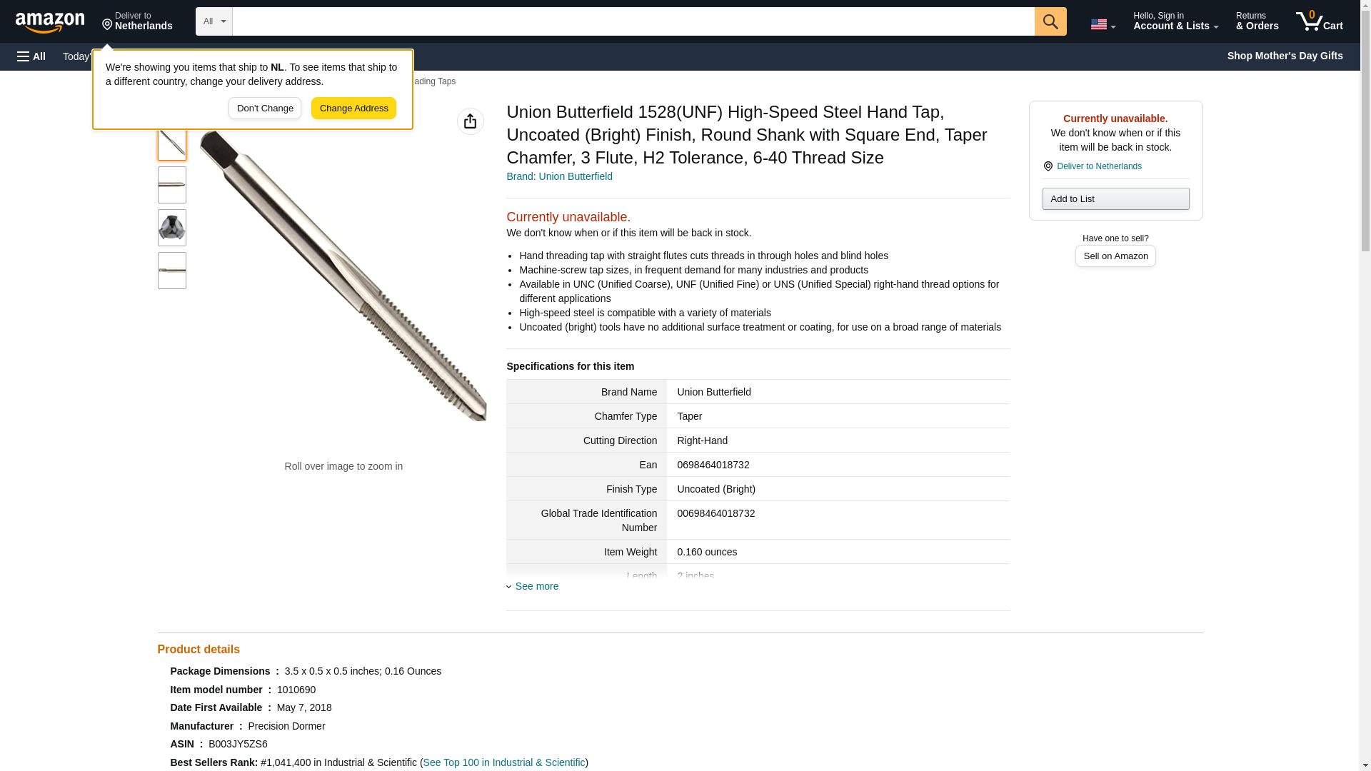 Union Butterfield 1528(UNF) High-Speed Steel Hand Tap, Uncoated (Bright) Finish, Round Shank with Square End, Taper Chamfer, 3 Flute, H2 Tolerance, 6-40 Thread Size