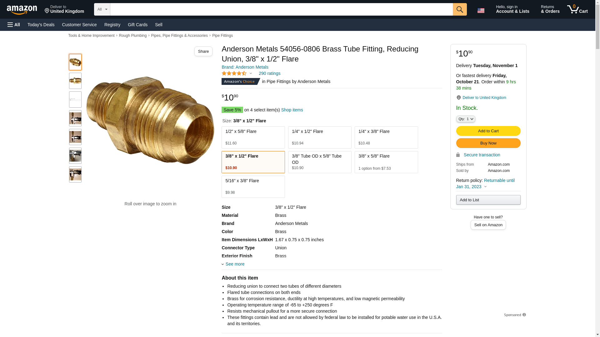 Anderson Metals 54056-0806 Brass Tube Fitting, Reducing Union, 3/8" x 1/2" Flare