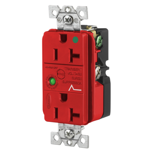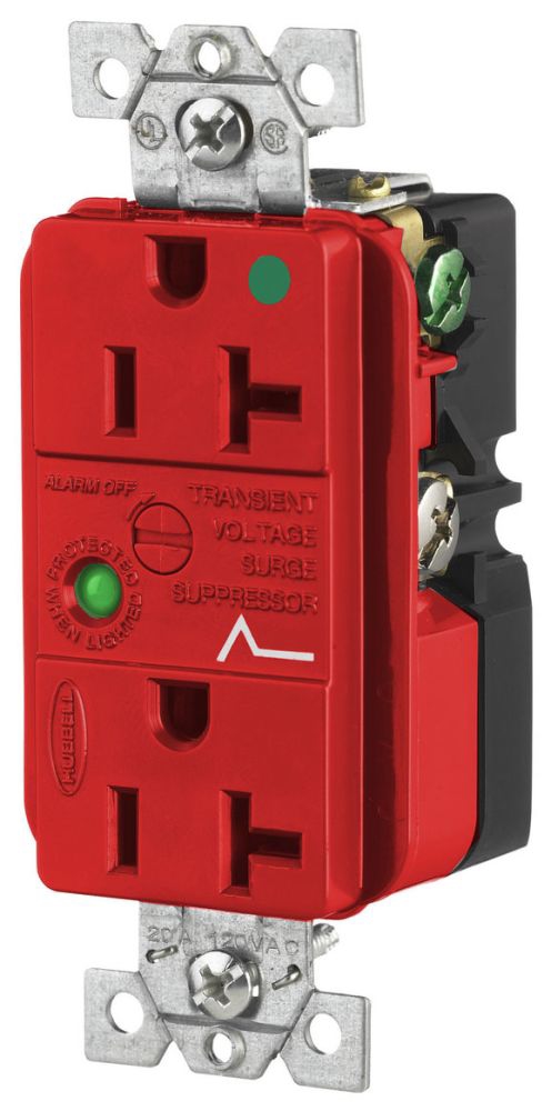 <br /><br /> Item: Receptacle<br /> Type - Plugs and Receptacles: Straight Blade<br /> Application Environment: Hospital Grade<br /> Amps - Plugs and Receptacles: 20<br /> NEMA Receptacle Configuration - Plugs and Receptacles: 5-20R<br /> Voltage - Plugs and Receptacles: 125VAC<br /> Number of Poles: 2<br /> Number of Wires: 3<br /> Tamper Resistant: No<br /> Weather Resistant - Plugs and Receptacles: No<br /> Outlet Type - Plugs and Receptacles: Decorator Duplex<br /> Mounting Type - Plugs and Receptacles: Flush<br /> Color - Plugs and Receptacles: Red<br /> Item - Plugs and Receptacles: Receptacle<br /> Wiring Method - Plugs and Receptacles: Side<br /> Surge Suppression: Yes<br /> Special Features: Audible Alarm<br /> Material: Nylon<br /> Phase: 1<br /> HP: 1.0<br /> Power Indicator: Yes<br /> Corrosion Resistant: No<br /> Number of Gangs: 1<br />