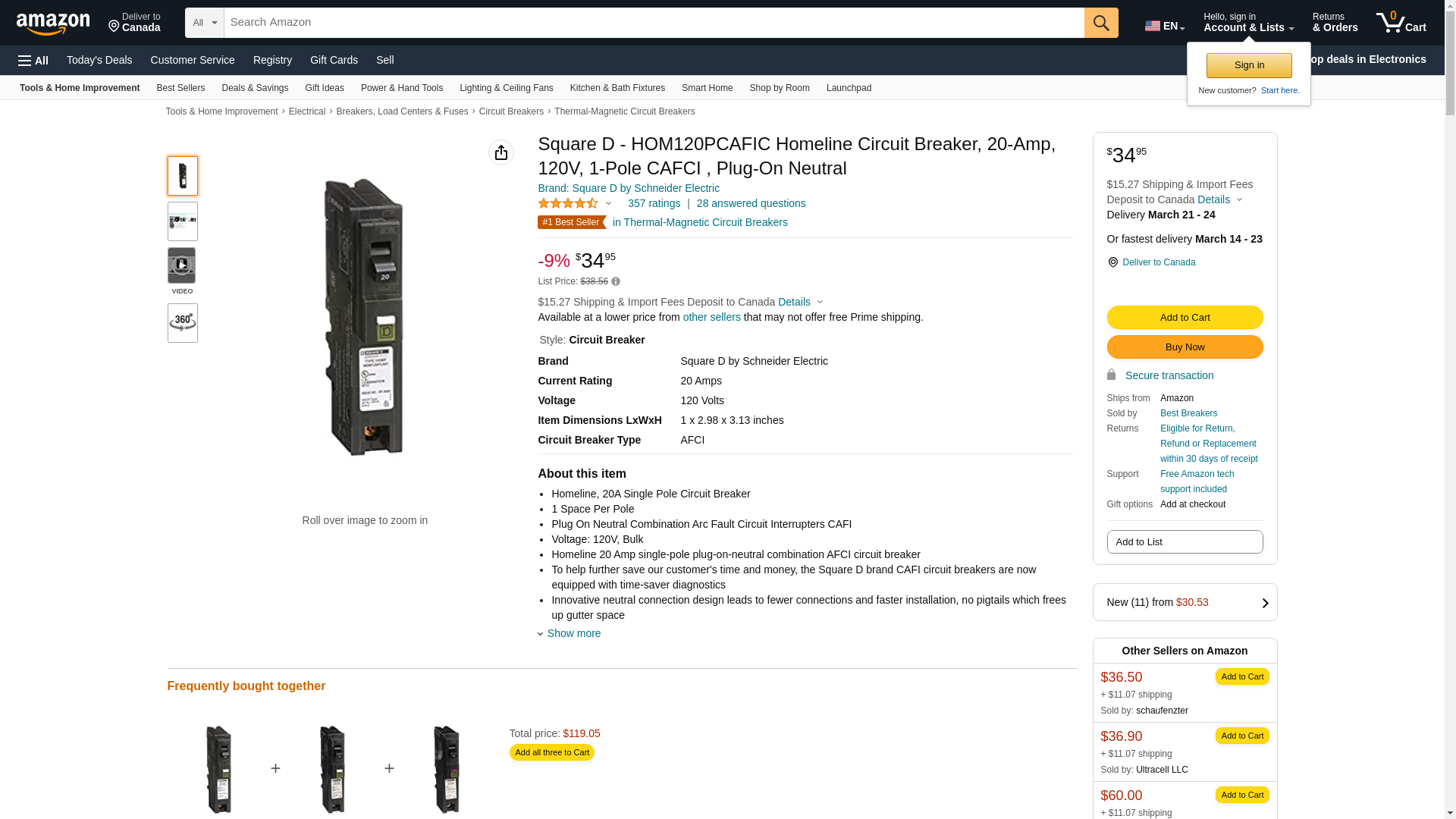 Square D - HOM120PCAFIC Homeline Circuit Breaker, 20-Amp, 120V, 1-Pole CAFCI , Plug-On Neutral