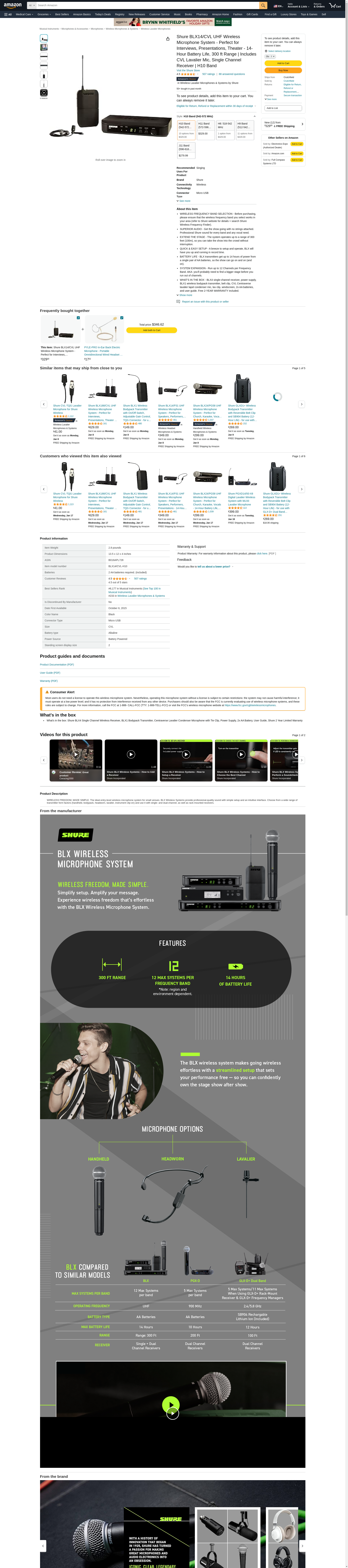 | Feature | Includes BLX4 wireless receiver, BLX1 body pack transmitter, CVL Lavalier microphone, power supply, Lavalier clip, windscreens, and user guide. |