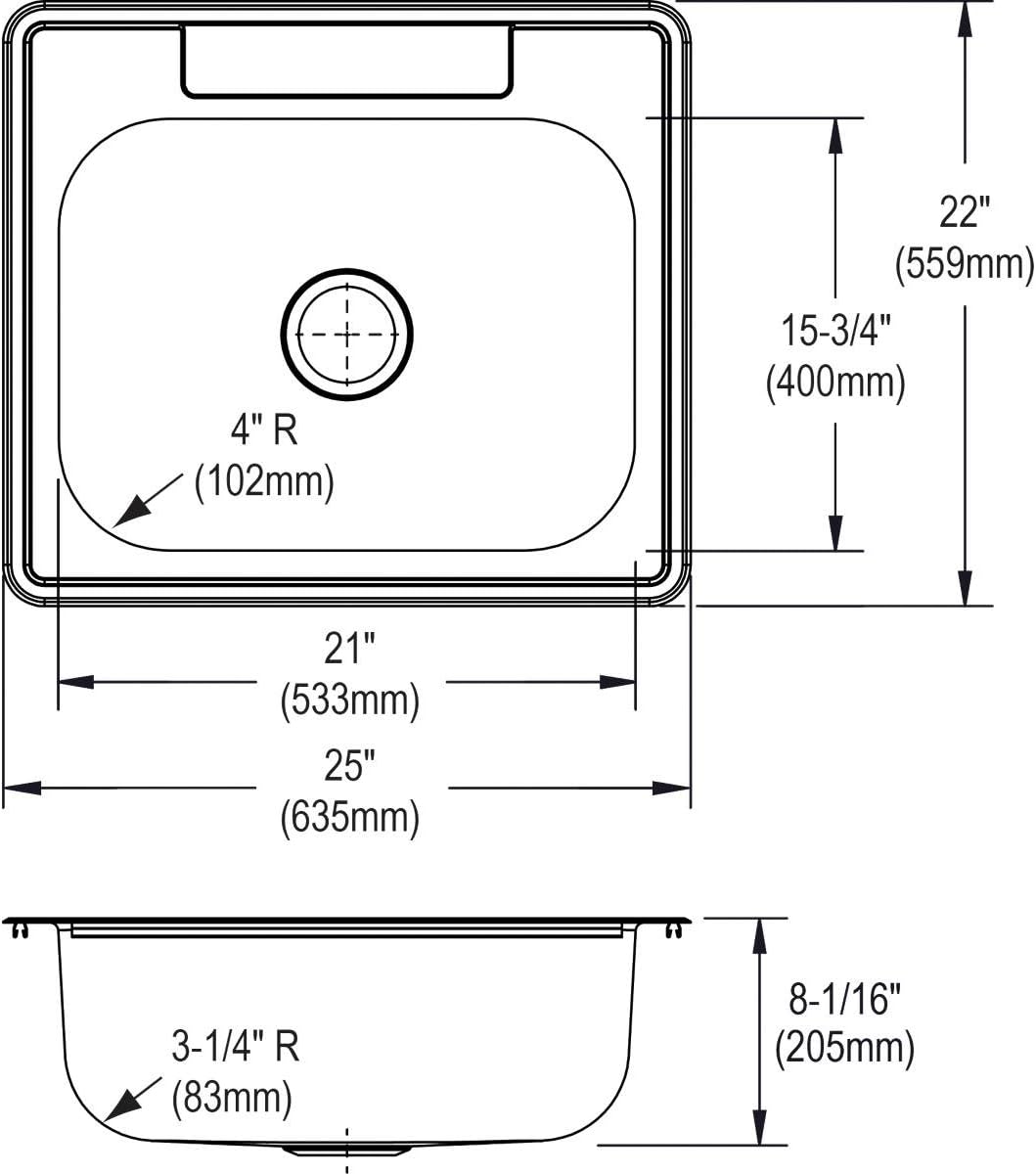 - Sink Dimensions: 25" X 22" X 8-1/16" Min. Cabinet Size: 30"