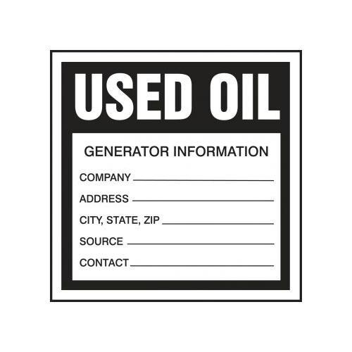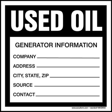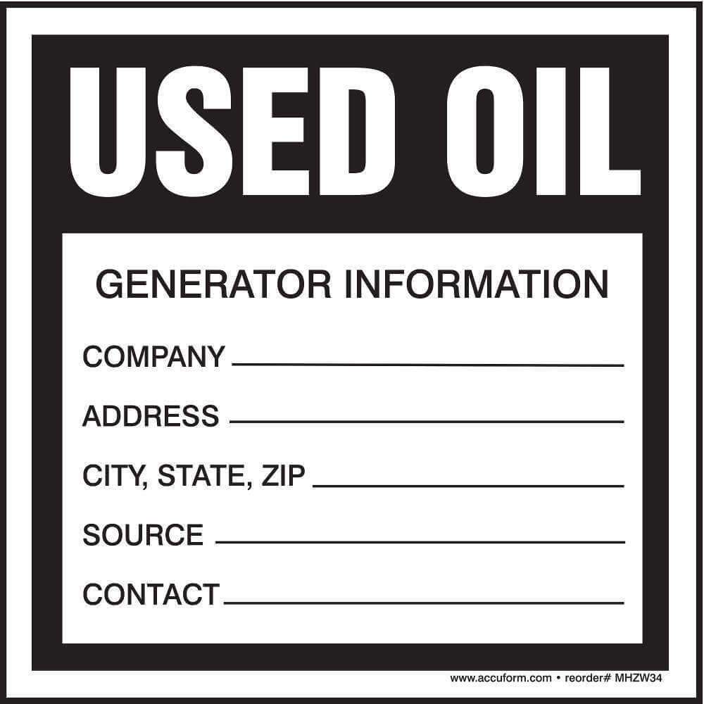 Accuform, MHZW34EVL, 6" x 6" Hazardous Waste Label "Used Oil" Adhesive-Poly Sheet Features: Can be used for limited outdoor exposure Gloss surface easily wipes clean of dirt, dust, and other liquids Permanent acrylic adhesive back 2.5-mil printed label with non-coat surface to write-on with pen or marker