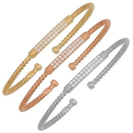 This Italian cuff bangle exudes elegance and style in every angle and is is set with cubic zirconia stones that exude femininity and charm. The bracelet is crafted of white, rose or yellow gold and available individually or in a set of three. <br /> <br /> <ul> <li>Style: Bangle</li> <li>Gemstone colors: White</li> <li>Gemstone shapes: Round</li> <li>24 prong-set round-cut cubic zirconia each measure 1.3 mm</li> <li>Metal: Gold over silver or rhodium-plated silver</li> <li>Finish: High polish</li> <li>Bracelet dimensions: 4 mm wide x 61 mm diameter</li> </ul> <br /> <b><i>All carat weights and measurements are approximate and may vary slightly from the listed dimensions. Treatment code CR (cubic zirconia). See <a href="http://www.overstock.com/2200/static.html" target="_blank"><span class="links">Treatment Guide</span></a> for further information.</i></b> <br />