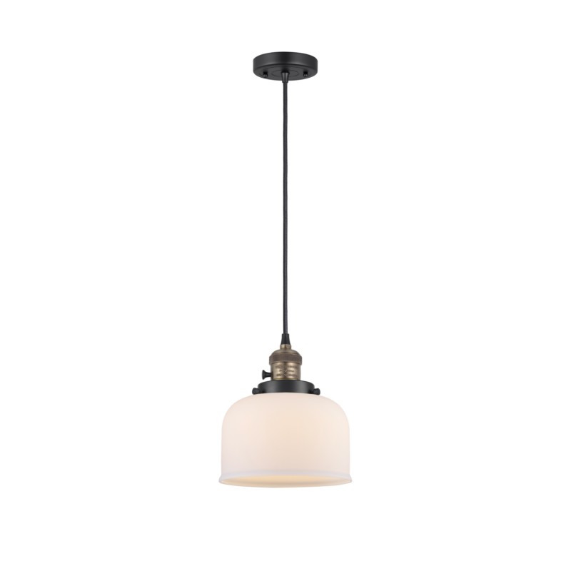 INNOVATIONS 201CSW-BAB-G71 1-Light Mini Pendant Black Antique Brass. Collection: Franklin Restoration. Style: Industrial, Farmhouse, Restoration-Vintage, Traditional. Metal Finish: Black Antique Brass. Metal Finish (Canopy/Backplate): Black Antique Brass. Material: Steel, Cast Brass, Glass. Dimension(in): 10(H) x 8(W) x 8(Dia). Min/Max Height (Fixture Height with Cord or Included Stems & Canopy)(in): 13/131. Wire/Cord: 10 Feet Of Black Textured Cord. Bulb: (1)60W Medium Base,Dimmable(Not Included). Maximum Wattage Per Socket: 100. Voltage: 120. Color Temperature (Kelvin): 2200. CRI: 99.9. Lumens: 220. Glass Shade Description: Matte White Cased Large Bell. Glass or Metal Shade Color: Matte White. Shade Material: Glass. Glass Type: Frosted. Shade Shape: Bell. Shade Dimension(in): 8(W) x 5.75(H). Fitter Measurement (Glass Or Metal Shade Fitter Size): 3.25 inch Fitter. Canopy Dimension(in): 4.5(Dia) x 0.75(H). Sloped Ceiling Compatible: Yes. California Proposition 65 Warning Required: Yes. UL & ETL Certification: Damp Location.