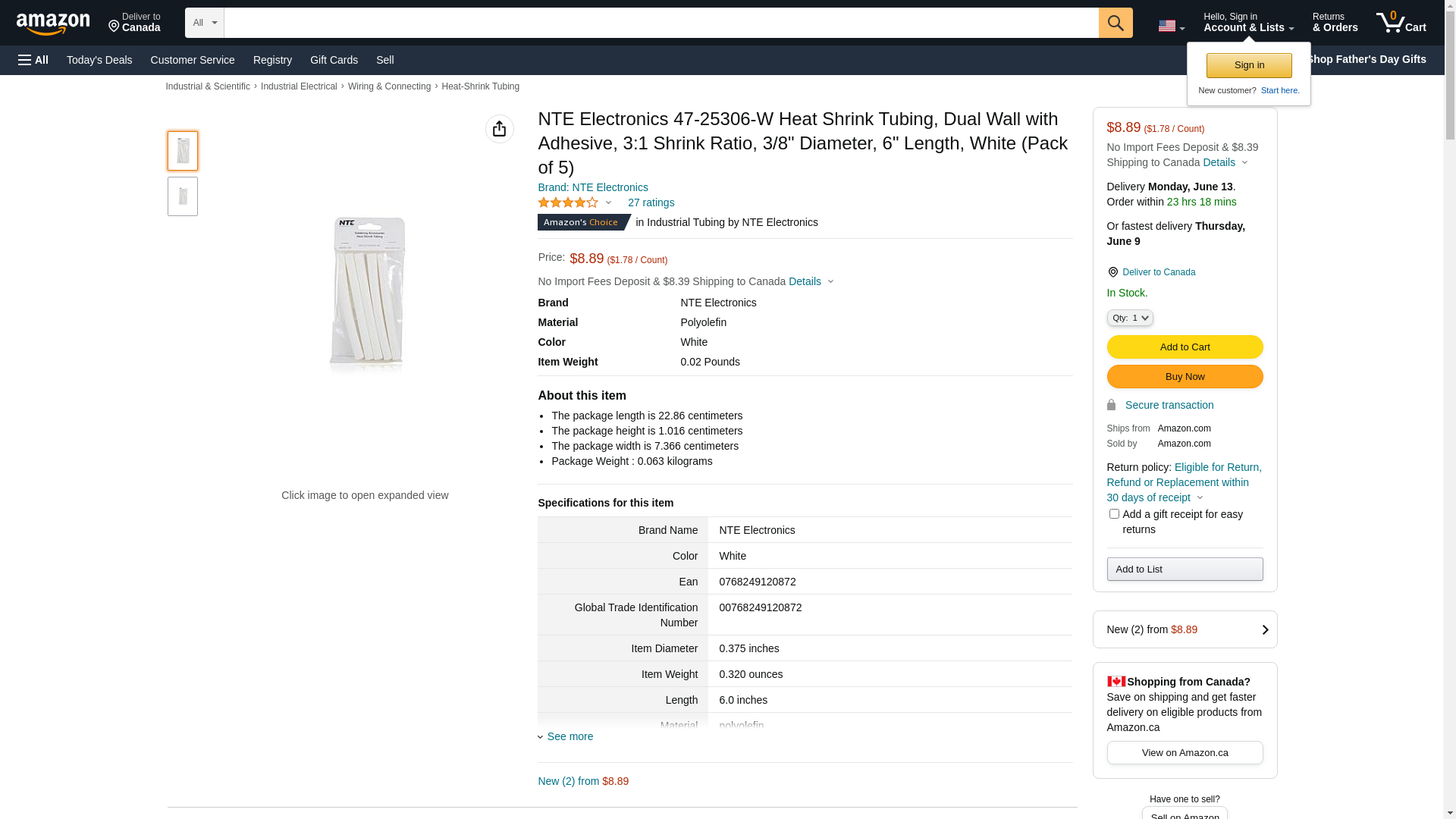 NTE Electronics 47-25306-W Heat Shrink Tubing, Dual Wall with Adhesive, 3:1 Shrink Ratio, 3/8" Diameter, 6" Length, White (Pack of 5)