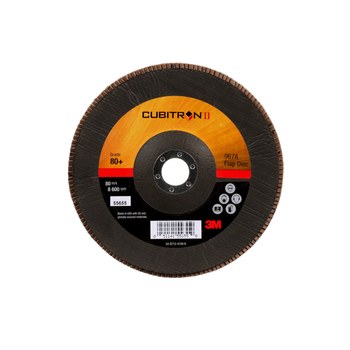 3M Cubitron II coated 967A Type 29 flap disc uses ceramic aluminum oxide as the abrasive material and has a diameter of 7 in. 3M incorporates this ceramic aluminum oxide material into the flap disc forming a grit of 80. All abrasive products that rotate or spin, such as the ones in this category, have a maximum speed at which you can run them. This 3M flap disc can be run at a maximum speed of 8600 RPMs.