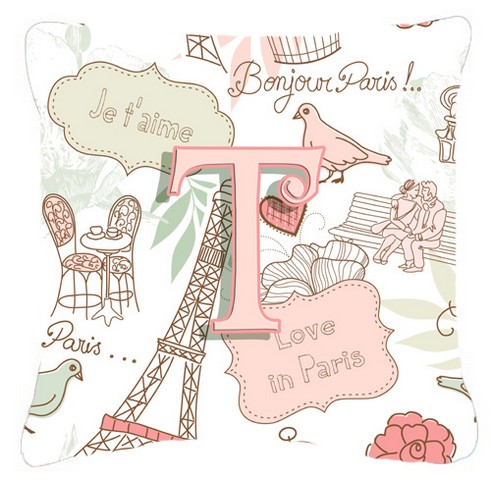 Carolines Treasures CJ2002-TPW1414 Letter T Love In Paris Pink Canvas Fabric Decorative Pillow