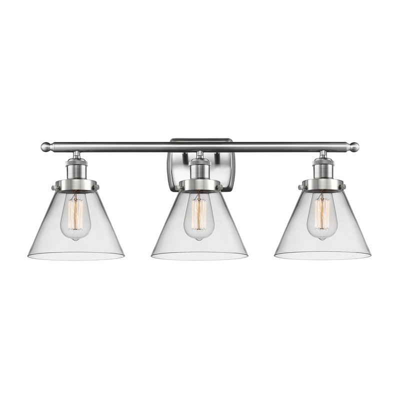 INNOVATIONS LIGHTING 916-3W-SN-G42 BALLSTON LARGE CONE 3 LIGHT 26 INCH CLEAR GLASS VANITY LIGHT, BRUSHED SATIN...