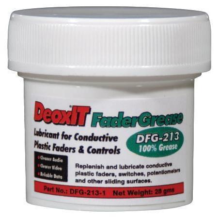 DeoxIT FaderGrease is a precision grease for conductive plastic surfaces and moving contact (metal-to-plastic and plastic-to-plastic) surfaces. Use when surfaces require thicker lubrication/protection than the DeoxIT Fader can supply. It replenishes lubrication lost on surfaces that have been cleaned with solvents or other cleaning solutions. DeoxIT FaderGrease was specifically formulated to improve conductivity and lubricate conductive plastic and carbon compound faders, switches and other mechanisms with sliding surfaces. Over time these components lose their original lubrication from wear and/or repeated cleaning. Dust, dirt, smoke, drink spills and other contamination also degrade the components’ lubricant. The need for re-lubrication is necessary to avoid excess wear and abrasion to the plastic surfaces.