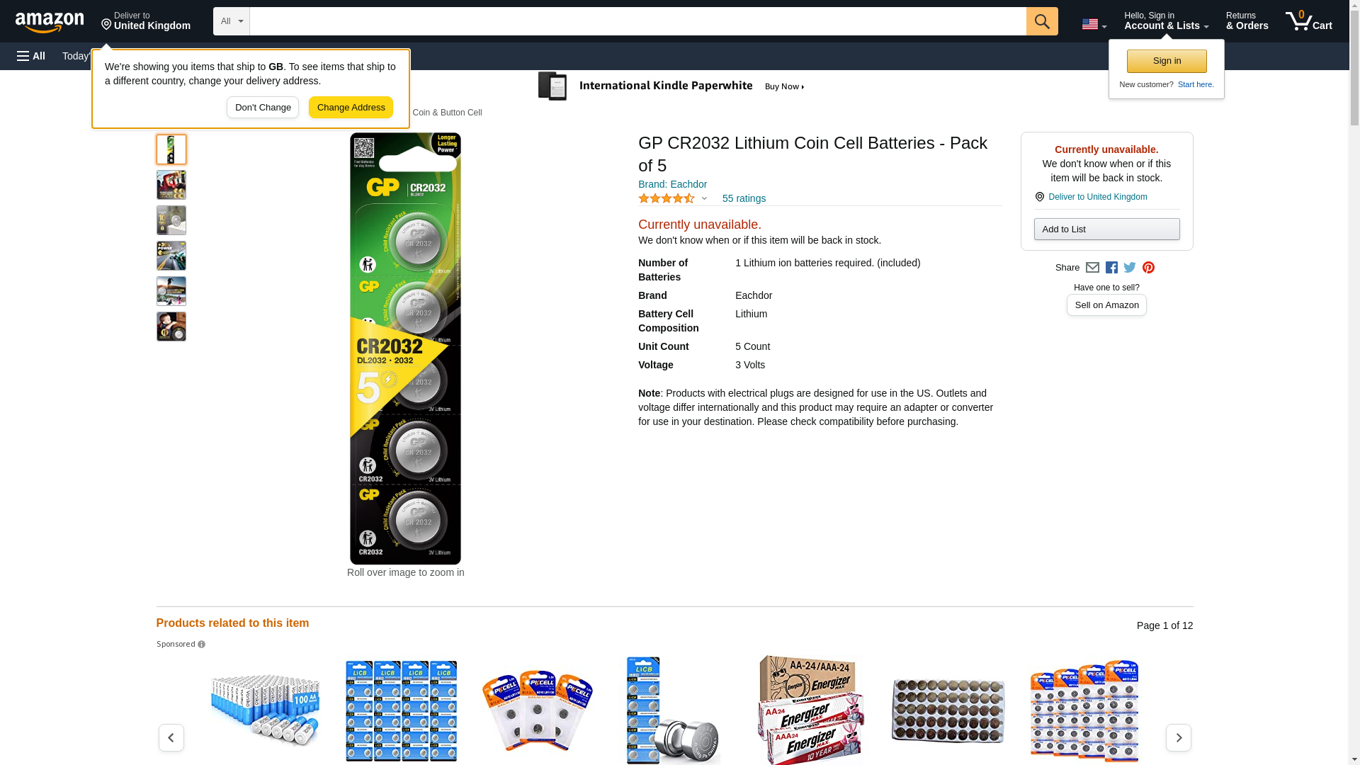 GP CR2032 Lithium Coin Cell Batteries - Pack of 5