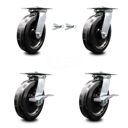 Listing is for a set of four (4) Service Caster Series #35 casters, two (2) swivel casters with bolt on swivel locks and two (2) swivel casters with side lock brakes, with 8" diameter by 2" wide phenolic wheels and maintenance free precision ball wheel bearings. Capable of supporting a total weight of 5,000 lbs. (1,250 lbs./caster). When searching for a reliable and durable solution to your caster needs, consider Service Caster Series 35 phenolic wheel casters. The Service Caster Series #35 is ideal for medium and heavy duty material handling, carts, equipment, and shop projects. The zinc plated finish provides durability under any condition, and the phenolic resin wheels are highly resistant to impact damage, providing protection for floors in commercial and industrial settings. Not only are they resistant to water, oil, and grease, but because they are non-metallic, these wheels are spark proof, keeping you safely moving forward.