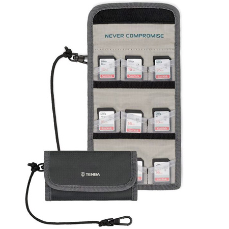 The Reload SD 9 memory card wallet carries up to 9 SD cards (or Micro SD with an adapter), and it has a velcro loop to attach to a belt, shoulder strap or backpack harness straps to keep memory cards close at hand. Tenba's unique angled pockets make it easy to remove cards quickly, and the included security cable attaches to a D-ring on a bag or tripod for safety. A clear pocket on the back provides storage for business cards.</p>