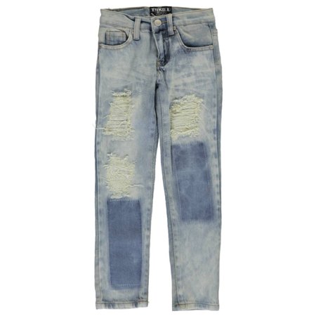 Give her a thrilling look with these skinny jeans from Thrill! Thrill skinny jeans Stretch denim Faded vintage wash Button-and-zip fly Ripped accents 5-pocket design 55% ramie, 26% cotton, 17% polyester, 2% spandex Machine wash warm Imported
