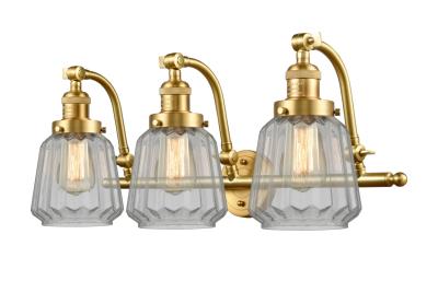 INNOVATIONS LIGHTING 515-3W-SG-G142-LED Chatham 3 Light Bath Vanity Light part of the Franklin Restoration Collection. The Chatham 3 Light Bath Vanity Light is part of the Franklin Restoration Collection. Solid Brass 180 Degree Adjustable Swivels with internal teeth that lock in at 5 degree intervals. Collection: Franklin Restoration. Material: Steel, Cast Brass, Glass. Metal Finish(Body): Satin Gold. Metal Finish(Canopy/Backplate): Satin Gold. Dimension(in): 28(W) x 12(H) x 10(Ext). Bulb: (3)3.5 Watt LED Vintage Medium Base Bulb Included,Dimmable. Color Temperature: 2700. Color Rendering Index(CRI): 82. Lumens): 350. Voltage: 120. Glass: Clear Chatham/Transparent; Ribbed. Shade Shape: Novelty. Shade Material: Glass. Shade Size(in): 6.25 X 6.75. Shade Fitter Measurement: 3.25 inch Fitter. Canopy Dimension(in): 4.5. Backplate Dimension(in): 4.5x0.75. Solid Brass 180 Degree Adjustable Swivels with internal teeth that lock in at 5 degree intervals. Fixture can be hung with bulbs facing up or down. UL/CUL Damp Rated. Warranty: 2 Year Finish, Lifetime Electrical.