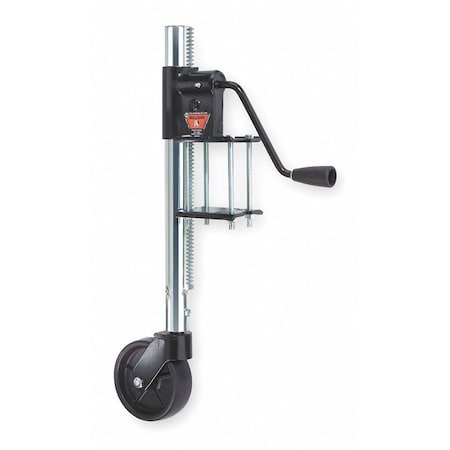 'RV/Marine Trailer Jack, Load Capacity 750 Pounds, Lift Range 7-24 Inches, Overall Height 27 Inches, Zinc Plated Housing and Tube, Gear Type, Retractable Wheel'